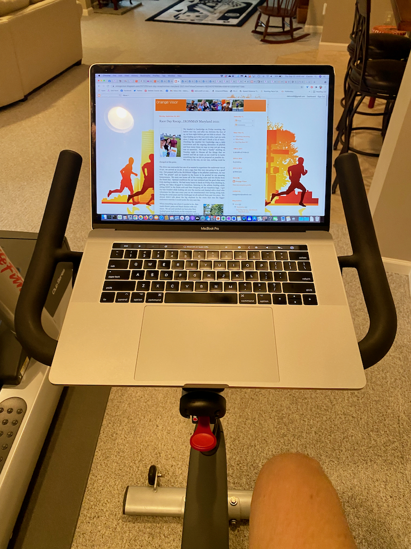 With heavy rain all night long and into the morning coupled with 60°, an outdoor ride was not my preference so I hit the basement at 7:30 AM for a 20-mile spin. Reading my MRTT friend Julie’s recap of Ironman Cambridge from Saturday kept me motivated and pedaling fast (17.2 MPH average speed) on my spin bike (affiliate link).